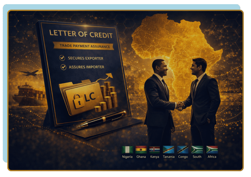 Africa Trade Finance Consulting Company facilitates Letters of Credit through established financial institutions, supporting businesses across Nigeria, Ghana, Kenya, Tanzania, Congo, South Africa, and other African markets.